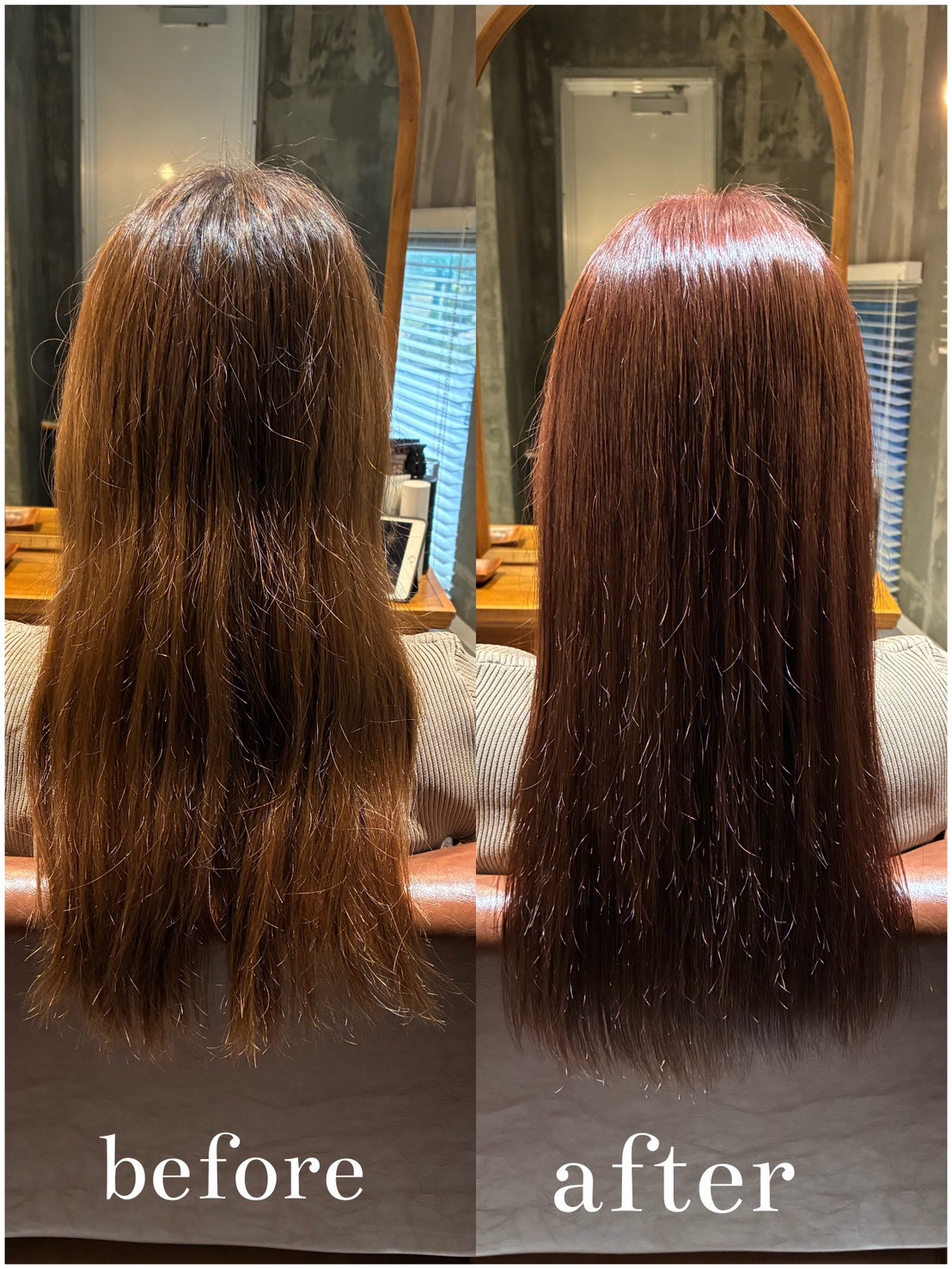 お仕上がりは、気にされていた表面の毛羽立ちがピタッと収まり、光が綺麗に一直線に流れる艶髪になりました。 写真でもわかる通り、深みのある色合いと滑らかな質感が復活しています。