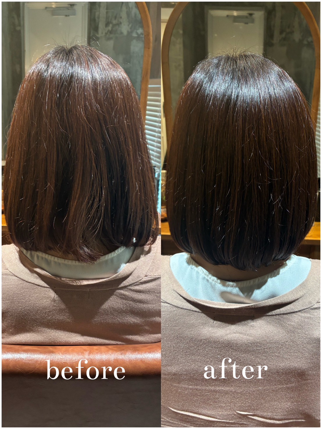 お仕上がりは、毛先までストンと落ち着き、内側に綺麗にまとまる艶ボブになりました。 写真でもわかる通り、表面に滑らかな光の反射が生まれ、清潔感のある仕上がりになっています。