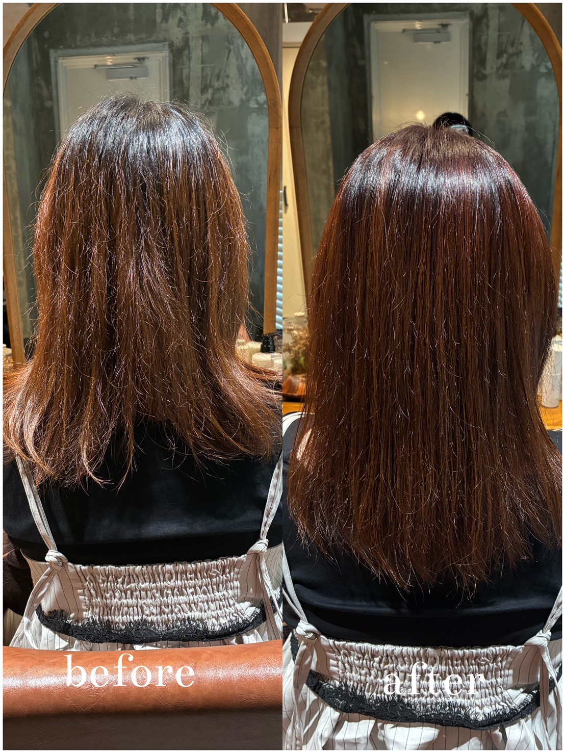 こちらのお客様は、繰り返しのカラーによって毛先のパサつきが目立ち、色がすぐに抜けて全体的に疲れた印象に見えてしまうのがお悩みでした。