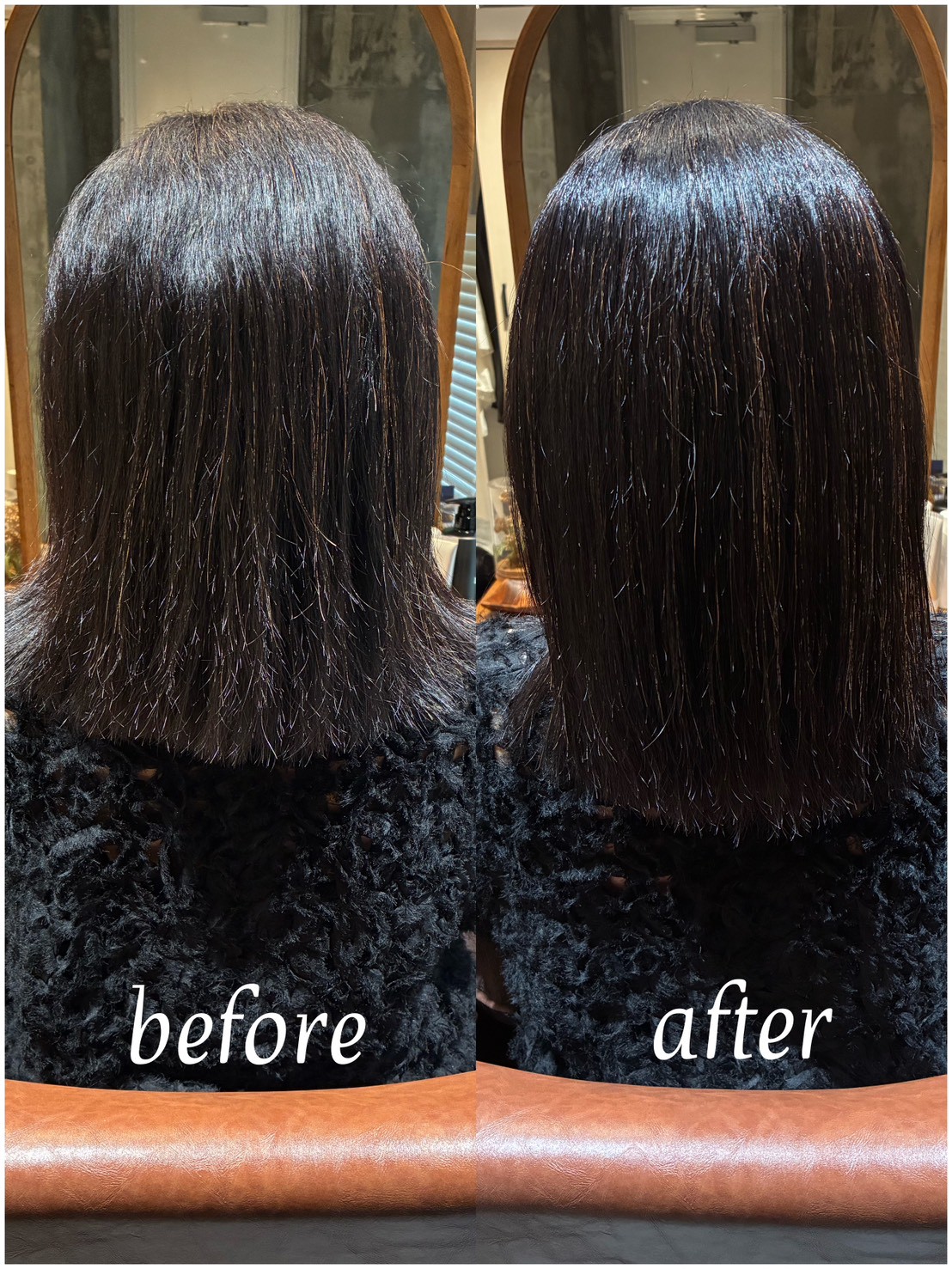 【現在の髪の状況】 お仕上がりは、気にされていた表面のポワつきが解消され、鏡のように光を反射する美しい質感になりました。 写真でもわかる通り、毛先までストンと落ち着き、指通りの良い柔らかな髪質に仕上がっています。